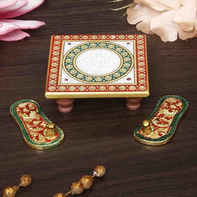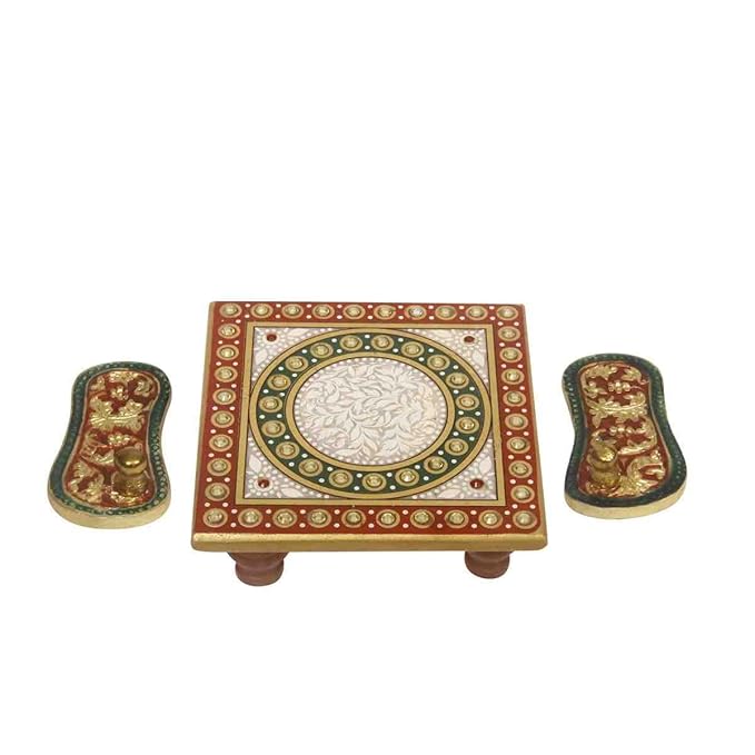 Handicrafts Paradise Marble Circular Pattern Chowki(4×4 inch) and Meena Work Lakshmi Paduka for Puja Set of 2 Items